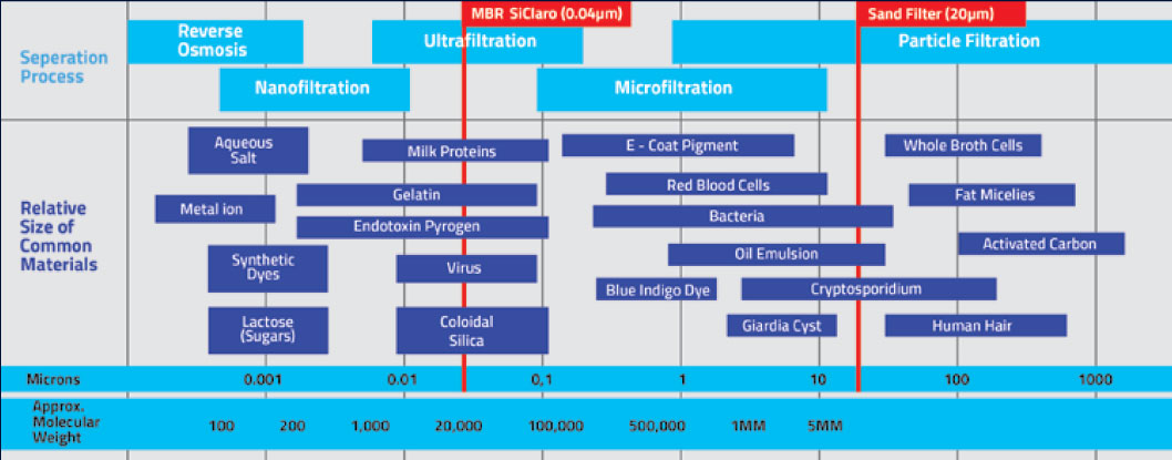 The MBR replaces the secondary clarification and sand filters found in a conventional wastewater treatment plant and provides a higher quality treated wastewater. This allows for increased performance with a smaller footprint. In an MBR, the membranes create a solids barrier and therefore the process is not subject to gravity settling solids limitations, as in conventional clarifiers.